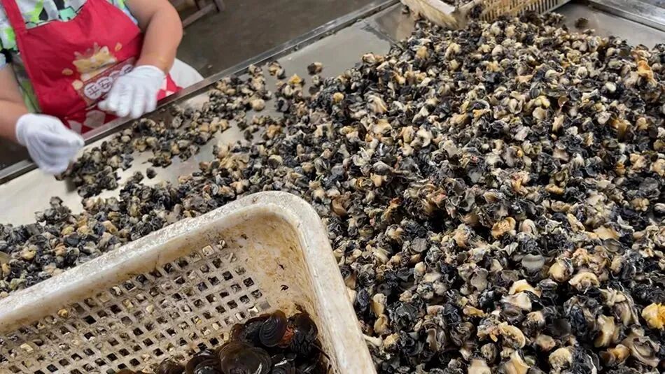 巖汪湖鎮黃蘆山村里的福壽螺加工廠,工人們正過篩、稱重福壽螺肉。