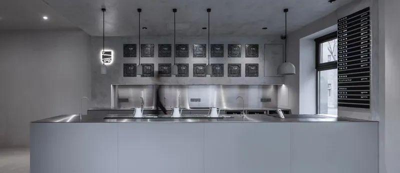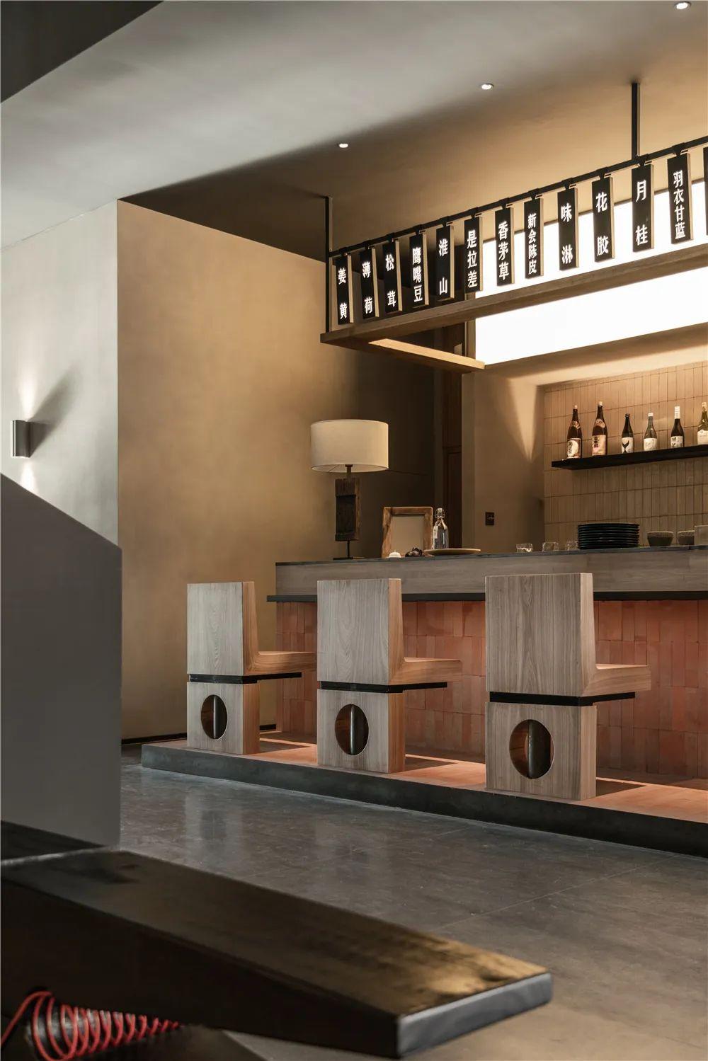 設計以“侘寂煙火”為主題,讓消費者可以感受時間賦予事物的痕跡中感受市井煙火的理念,入口設置了裝有產品食材陳列柜,顧客可以等候時了解每一種食材,增加跟消費者的互動。