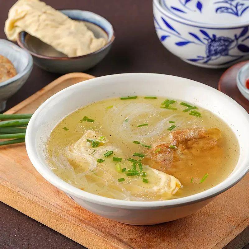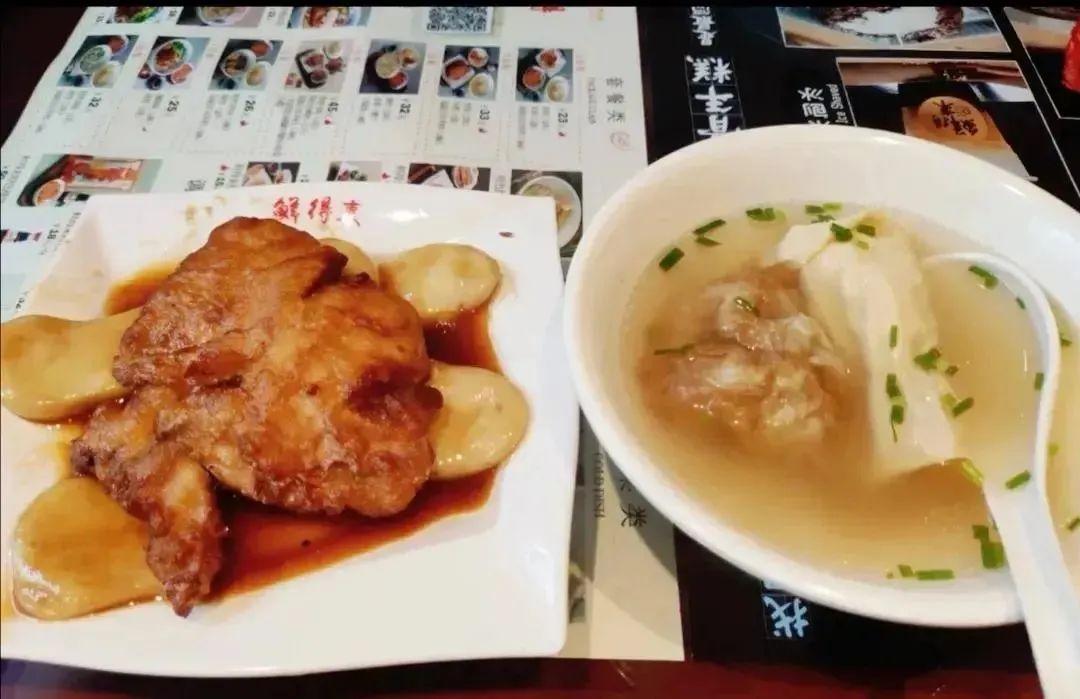 除了排骨外,組合里的雙檔湯也非常不錯,所謂“雙檔”就是由兩個百葉包、兩個水面筋、組成。和排骨年糕一起配合著店鋪的名字“鮮得來”,相得益彰。