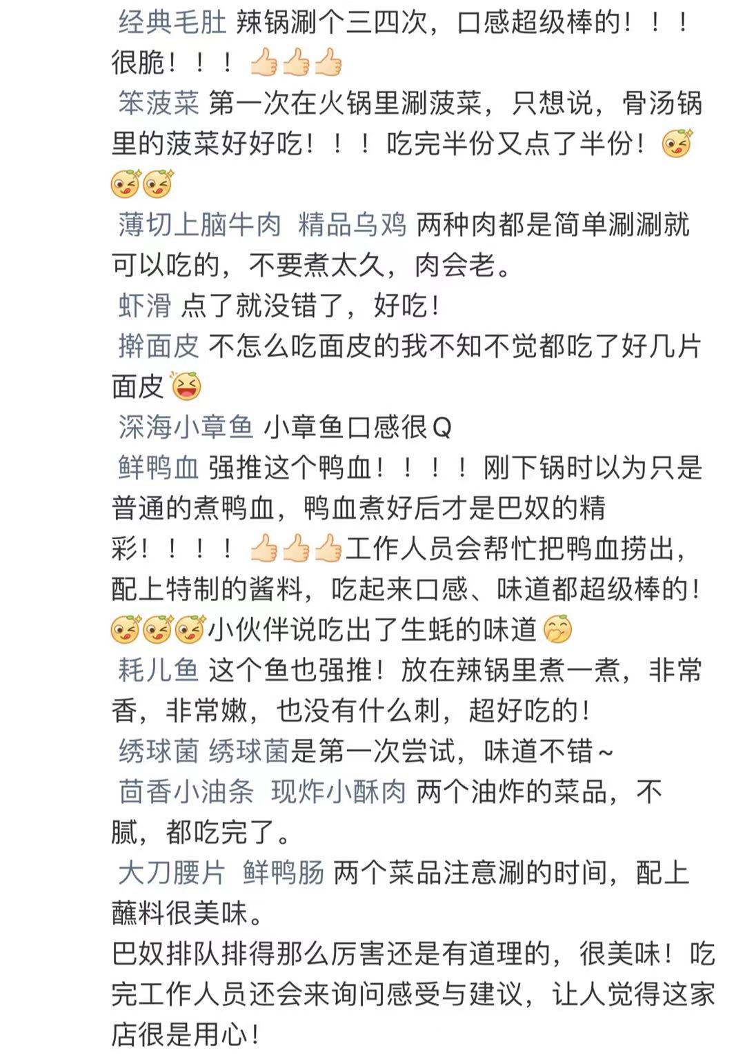 大家清一色圍繞菜品本身各種“較真”——野山菌湯底濃郁鮮美、經典毛肚入口鮮脆彈牙、茴香小油條筋道適中、腰片刀工絕佳、繡球菌嚼勁吸湯、鮮鴨血在舌尖上跳動……簡直是一部吃貨百科。