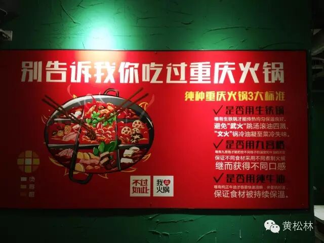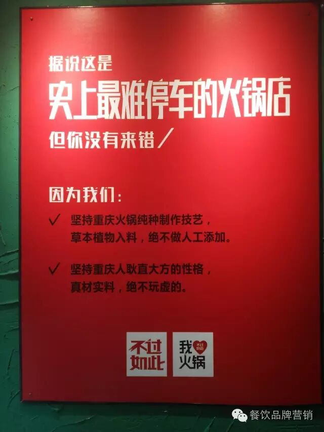 經典文案《據說這是史上最難停車的火鍋店》,以退為進,解決了顧客抱怨不能停車的問題,化腐朽為神奇,這本來是不過如此火鍋最大的缺點,但是卻變成了一種逆天的符號。《重慶火鍋的三大標準》提出了生鐵鍋、九宮格、純牛油是重慶火鍋的三大標準。