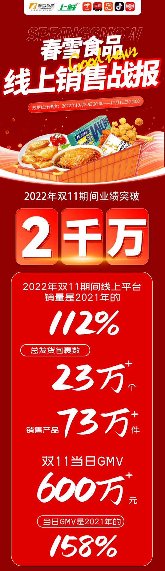 今年雙十一,預制菜在天貓、京東等電商平臺強勢出圈。 向上滑動閱覽 向上滑動閱覽 向上滑動閱覽 向上滑動閱覽 值得關注的是,京東預制菜肴雙11期間零售成交額同比增長了260%,再次印證了預制菜在消費端也逐漸熱了起來,其中正大廚易預制菜銷量同比增長了近5倍。銷量排名靠前的商家除了有在天貓上榜的西貝和美好食品,新消費品牌朕宅和珍味小梅園也交出了不錯的答卷。 向上滑動閱覽 2007年,海底撈就陸續登陸淘寶、京東等主要的線上購物平臺,并在自有平臺建立了海底撈線上商城。以往,海底撈在線上渠道,主要銷售火鍋底料、自熱火鍋、零食、品牌周邊等零售產品。雖然海底撈的產品規劃的更新發生在去年,但線上發布新品在今年是首次試水。布局線上渠道的營銷是海底撈一直以來的計劃,但疫情成為了催化劑,加速了這一進程。 2021年底,海底撈公布了全新的產品規劃,宣布海底撈將從全國、區域雙體系推進產品上新,從鍋底、菜品、小吃及體驗等全方位創新,且保持全國至少一年兩次的上新節奏。而今年的秋冬新品發布,恰逢雙十一購物節,除了10月28日首次以新品發布會線上直播的形式帶動產品銷售,公司還通過多場達人直播、短視頻的形式持續在雙十一期間為顧客們提供豐富的線上產品,觸達和影響更多年輕消費群體。 從活動方式來看,不僅有與傳統電商平臺優惠力度相當的199-30元滿減活動、秒殺產品活動,還強調了會員福利回饋,全場產品均支持使用“撈幣”全額兌換。與此同時,海底撈新成立不久的社區營運事業部,也在今年“雙11”期間集中發力。海底撈外送推出了冬日專享歡聚套餐、外送85折等優惠活動,滿足顧客的居家消費需求,自活動上線以來也取得了不俗的銷售成績。 西貝半小時售出百萬元訂單 而同樣參與這場年度線上購物狂歡節并取得不俗成績的還有西貝餐飲集團。2022年雙11活動,西貝在京東與天貓渠道前30分鐘銷售額就突破100萬元,前40分鐘的銷售額就超過了去年同期全天營業額。在天貓生鮮預制菜預售排行榜與京東預制菜-熱賣品牌榜上,西貝都排名第一。 2022年雙十一期間,西貝在京東牽頭發起了品類超級單品日活動,旗下賈國龍功夫菜品牌參與了京東生鮮預制菜會場領券滿159-50元活動,牛大骨、羊蝎子等熱門菜品也獲得了站內外的開屏曝光。值得注意的是,在天貓生鮮預制菜預售排行榜與京東預制菜-熱賣品牌榜上,西貝再次名列第一。 “我們的預制菜主要是基于零售品牌賈國龍功夫菜來做的,嚴選優質食材,聯合各大菜系名廚研發,主打地方美食”。據了解,在零售業務的布局上,西貝餐飲集團自2017年9月起上線西貝商城,到2019年9月集團旗下零售品牌賈國龍功夫菜正式成立,已經走過了5年的時間,而本次,已經是西貝在天貓與京東平臺上自2019年開始連續第四年霸榜。 今年9月,西貝餐飲創始人、董事長賈國龍在西貝餐飲集團秋季媒體溝通會上表示,今年,西貝的餐飲業務量約為50億元,功夫菜的業務量占比約10%。同時他表示,西貝的預制菜嘗試過進入商超,但是渠道的扣點很高。所以西貝目前正在打造的“賈國龍美食市集”,從一定意義來說,實現的是賈國龍期待的“自己建渠道”。 未來,西貝還將推出西貝專業兒童餐零售產品,特別是針對兒童的“早餐”需求,將把更適合兒童早餐的產品實現零售化。目前,在西貝商城的小程序上,已經有牛奶果蔬小饅頭、蒙古奶酪牛肉卷、完熟番茄牛肉醬莜面條條、蝦仁海苔莜面蒸餃等多款兒童餐產品上線。 王家渡:雙11瞄準1000W業績 “‘雙11’我們的銷售目標是破1000萬元,目前計劃達成率已有8到9成。”11月8日,談及今年的“雙11”銷售情況時,四川王家渡食品有限公司市場部總監楊靜表示心里已有了底。 站在預制菜發展風口,作為四川預制菜的頭部企業,王家渡公司成立于2008年,是眉州東坡集團旗下子公司,深耕川味食品行業,一直以來致力于中餐標準化的研究與探索。迎戰“雙11”,就像是對企業的一次“小考”。 今年的“雙11”同樣早早開始預熱,而前期營銷 一直是各大企業“各顯神通”的主舞臺。據楊靜介紹,早在10月中下旬,公司便通過多種渠道開展產品營銷。“目前全網曝光量已突破2.3億次!”對于這個成績,楊靜感到滿意。 “其中我們的明星產品——低溫午餐肉,占到了交易額的40%左右。”除此以外,王家渡公司還生產和銷售川味香腸以及高品質川味復合調味料和多種預制菜肴。在本次“雙11”營銷期間,該公司自主研發的低溫午餐肉依舊是當之無愧的“爆款”。 王家渡爆款產品低溫午餐肉 在楊靜等業內人士看來,由于自身的商品屬性,“雙11”在預制菜的銷售節點上并不算一個“爆點”。“我們研判春節期間將是預制菜消費的一個高潮。忙完‘雙11’,我們將立即投入春節市場的備戰。”楊靜介紹,“根據餐飲企業和消費者的不同需求,我們有不同的策略。例如,在B端推出午餐肉、料理包、罐頭等產品,在C端則主打芽菜扣肉、麻辣香鍋、肥腸干鍋等產品。”高金、春雪、龍大、三全、大湖預制菜銷售火爆