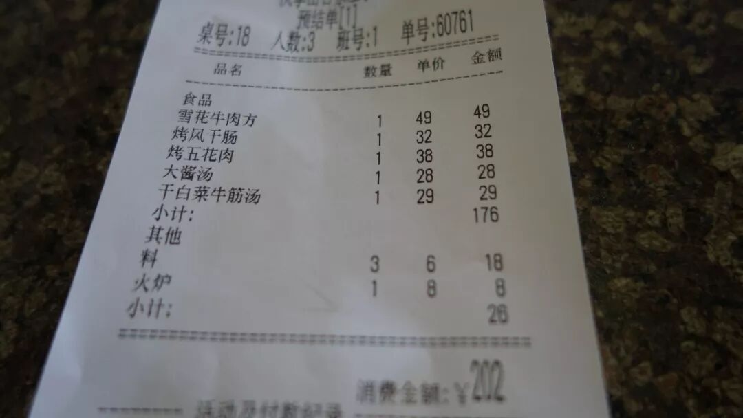 全價202元,我帶著父母吃的,因為有5折活動,所以算下來人均才30出頭,如果都是20-30歲的人群,用完5折券,人均50左右應該差不多,我認為這個價格在目前的消費水平來說已經不高了。