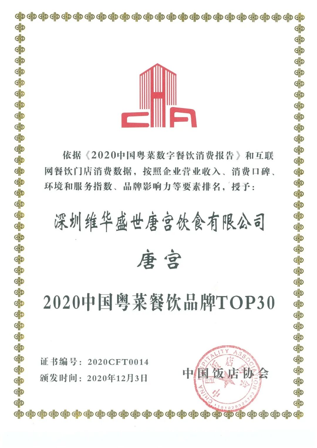 唐宮榮獲“2020中國粵菜餐飲品牌TOP30”及“食全食美名店”