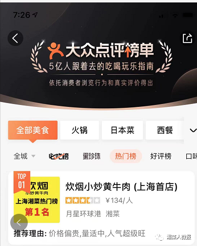 炊煙登頂大眾點評上海湘菜熱門榜第一