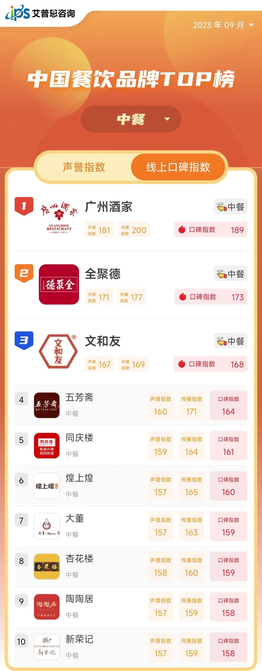 艾普思指數|2023年09月中國餐飲品牌線上口碑指數TOP50