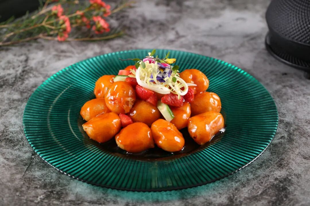 向群團隊用了差不多半年的時間來重構這道菜,首先用豬頸肉替代了傳統的肥肉,外皮還原傳統的酥脆做法,用草莓果汁調配的秘制醬汁替代傳統的糖醋汁,再點綴一些草莓粒、青瓜粒。