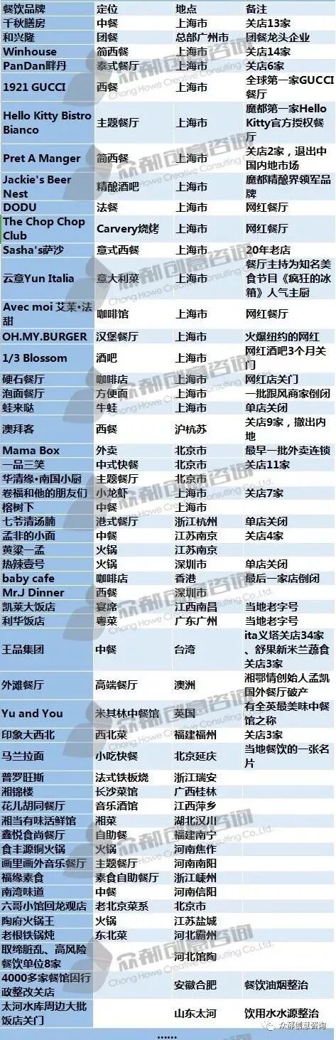 inshang 引言 2018餐飲市場大降溫,2019如何破冰? 來源 | 眾郝創意咨詢(ID:ichonghowe) 作者 | 眾郝餐飲研究院 年末總結2018,經濟遇冷、裁員潮、倒閉潮這些關鍵詞此起彼伏。 在前幾年的創業的熱漲高潮對比下,很多人把2018比作市場的寒冬。僅在2018上半年,北上廣深四個一線城市平均每個月10%的餐廳倒閉;全國餐飲突破3.5萬億元,但只有20%的餐廳賺錢…… 餐飲企業倒閉的倒閉,虧損的虧損,跨界打劫者無數,很難有逆風而上的品牌。和餐飲老板聊天,也是說很少見到今年勢頭好的品牌。 我們盤點了一批去年倒閉的餐廳,雖只是冰山一角,但其問題重重,觸目驚心。 2018餐飲企業關店名單 01 老品牌的悲哀 ▼ ? 資本迷途