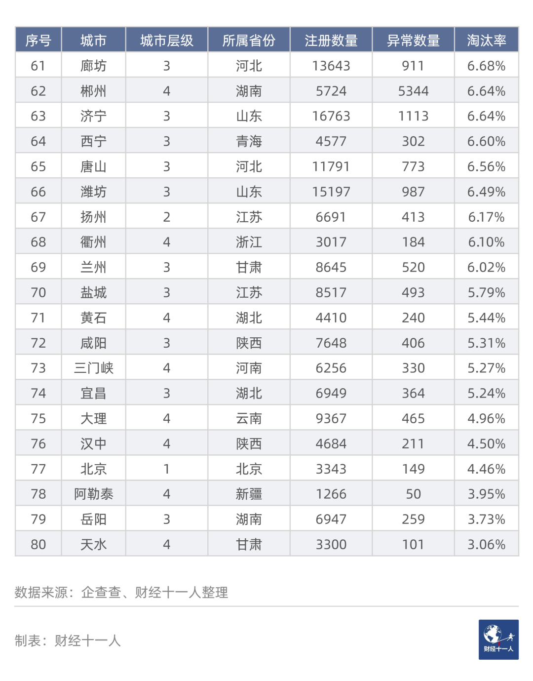 為了減少這種悲劇的發生,我們匯總了80個城市餐飲行業的淘汰率。