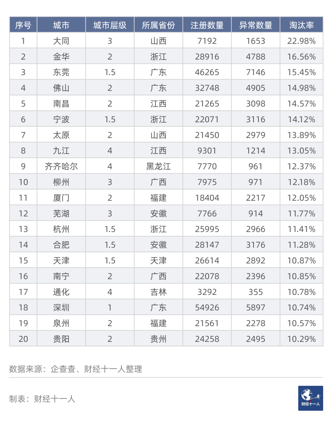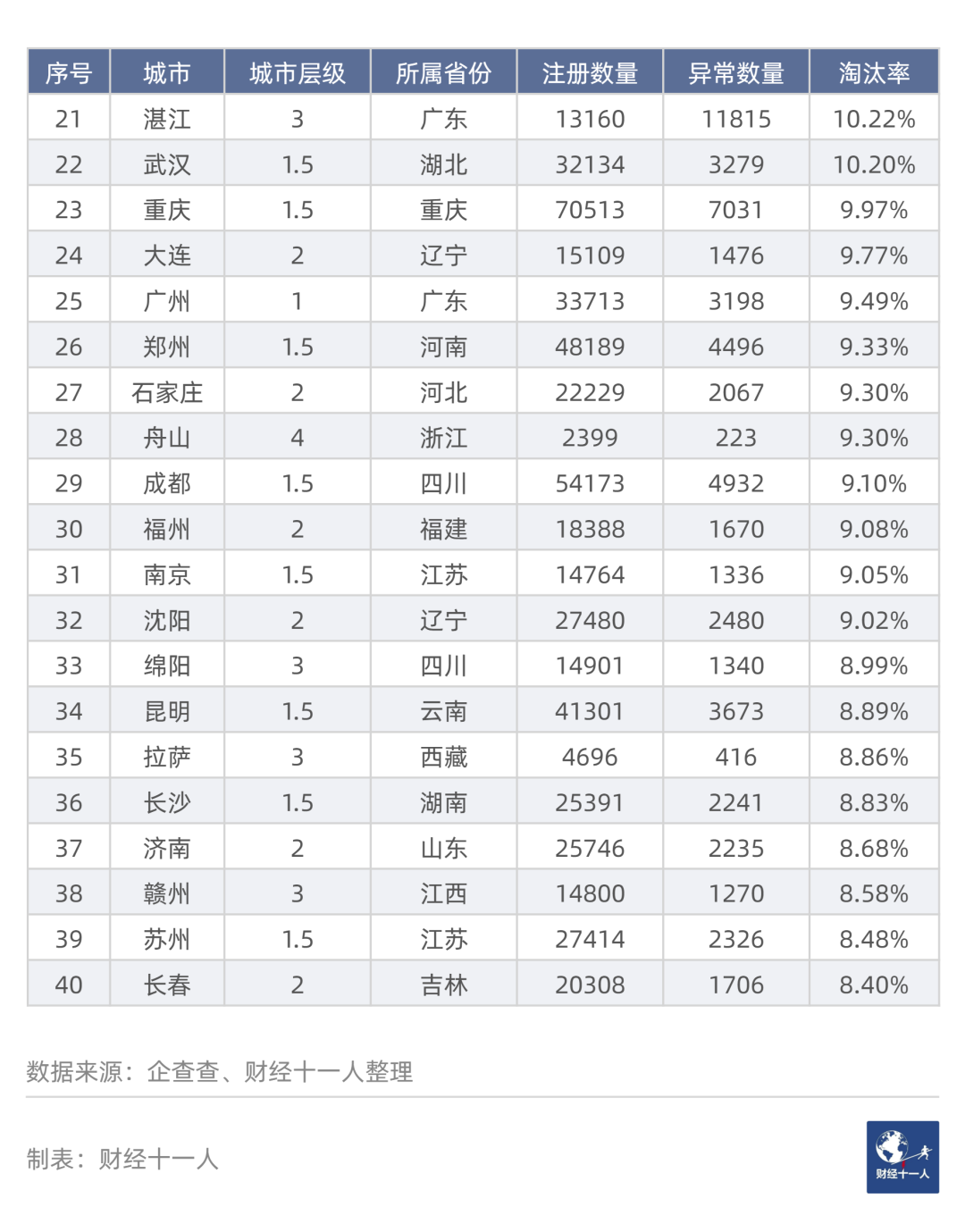 表4中,在26個注冊數量最高的城市中,18個城市的“3年淘汰率”屬于最高區域或次高區域,占比69.2%。