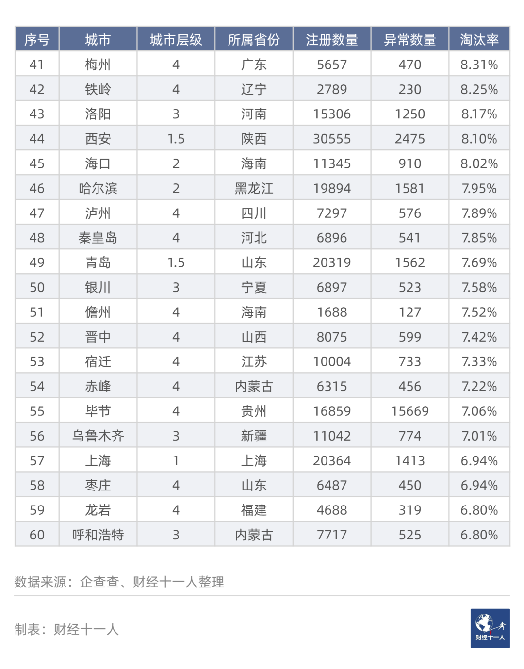 第三,個體戶淘汰率高的城市,企業淘汰率也較高;個體戶淘汰率低的,企業也低。