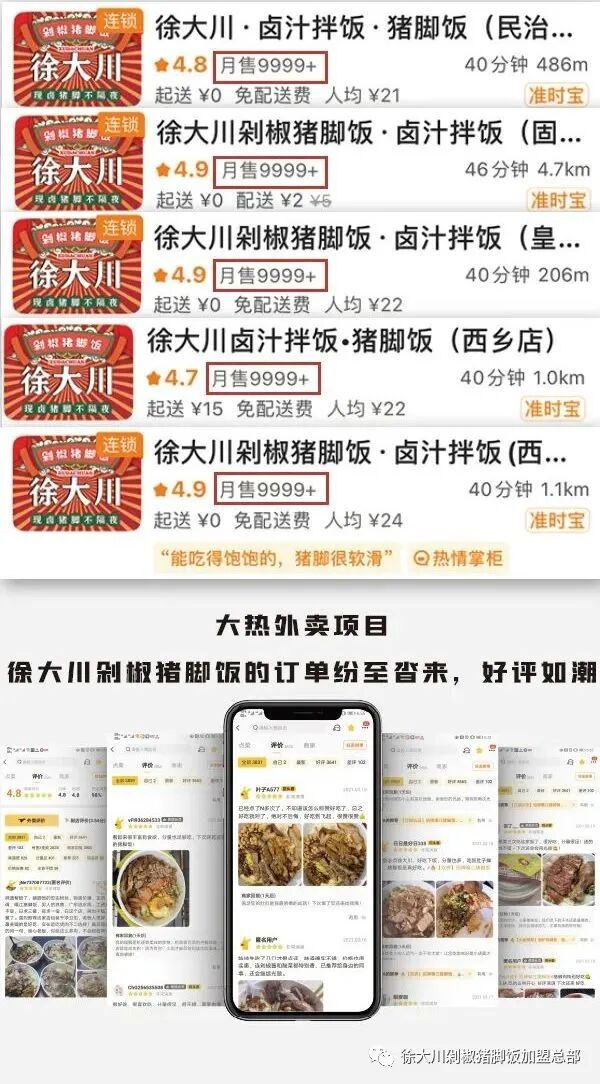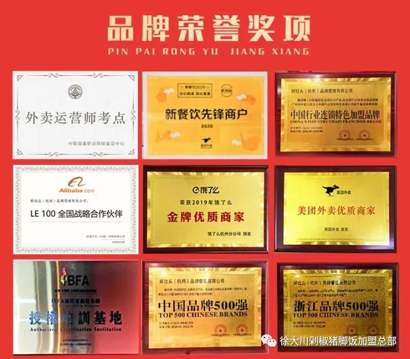 XU DA CHUAN 『徐大川豬腳飯』 成為豬腳飯品類黑馬的秘密 短短兩年時間,徐大川剁椒豬腳飯這個以豬腳飯為主的中式快餐品牌,騰空出世般迅速在在全國積累800+門店。自2020年以來,徐大川獲得多項品牌榮譽獎項,這就使得更多消費者以及加盟商更加想要深入了解到“徐大川剁椒豬腳飯”究竟有何過人之處?下面小編就為大家解答一下,揭開大家心中徐大川那神秘的面紗。 1、差異化的定位 據數據統計,去年中國餐飲收入4.67萬億,其中中式快餐就約占20%,可稱得上是餐飲業的“扛把子”。而在中式快餐中也有很多細分品類,“徐大川剁椒豬腳飯”綜合考慮了不同地域消費者的不同口味和習慣,將大眾所熟知的鹵豬腳結合川鹵元素進行產品打造。不僅有升級后鹵香濃郁的“招牌隆江豬腳飯”,還有“蜜汁叉燒飯”、“秘制手撕雞飯”、“明爐燒鴨飯”等十余種菜品。雖然看似菜品簡單,但搭配卻很豐富,不但可以滿足不同年齡、不同喜好的消費者需求,而且對于門店在不同區域擴張布局也有很大的好處。 2、追求極致性價比 “徐大川剁椒豬腳飯”的產品采用“主菜+3配菜”的搭配方式,不僅有主食,還配有黃豆、白菜、酸菜以及一大勺剁椒,每份都是滿滿一大碗。這樣一餐下來,人均消費的價格也不過在15~20元以內,性價比非常高。不管是上班族、中老年人,還是學生黨都能消費得起。即使這樣,他們也依然在產品上堅持用好食材、好原料,層層把關,每一步都毫不含糊!并且門店內整體環境溫馨、干凈,讓在店內用餐的顧客感覺吃得安心,吃得舒心。 3、小而高效的模式 傳統餐飲以堂食為主,而隨著互聯網的發展,線上經濟成為新的增長點和消費趨勢點,外賣也逐漸成為餐飲行業的盈利渠道之一。據中國烹飪協會提供的數據顯示,團餐市場份額約占餐飲市場的30%,并且規模也在逐年增長。“徐大川剁椒豬腳飯”歷經兩年打磨,將門店打造成“堂食+外賣+團餐”結合的模式,三個渠道:一個抵成本,一個純利潤,一個超預期。這樣小而高效的模式,也使其擁有強有勁的競爭力。 4、專業團隊賦能門店 一個連鎖加盟品牌想要發展得更好,必不可少的就是要能為加盟商賦能。“徐大川剁椒豬腳飯”認為只有把每一個門店都做好,基礎打扎實了,整個品牌才能長遠發展下去。所以“徐大川”對加盟商可謂是保姆式的扶持,開店前都會進行培訓,從門店選址到裝修,從開業活動到后期運營,從產品更新到品牌形象,總部也都是全程協助,為加盟商提供專業的服務和指導,讓加盟商開店更省心。 —歡迎咨詢— 微信號 | Xudachuan0819 電話號碼 | 18815545431
