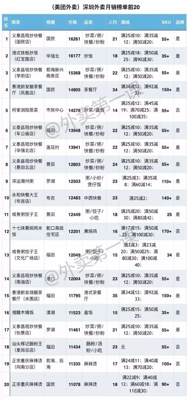 分別收錄美團平臺TOP20、餓了么平臺TOP10;
