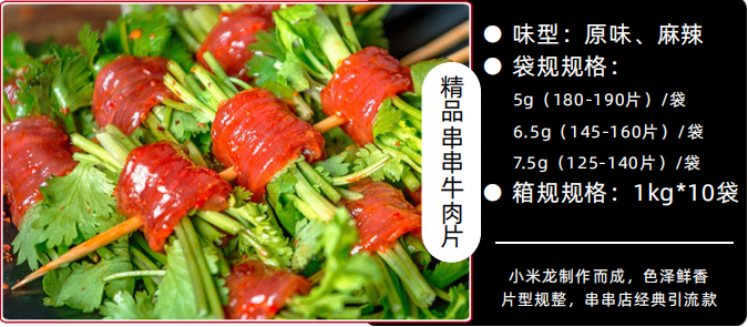 「好食材 聚食匯」——串串牛肉片 在厚重的串串香文化美食手冊中,串串牛肉片絕對是不可或缺的一頁。其鮮嫩多汁的口感、香氣四溢的調料,以及獨特的串燒方式及百搭的其他食材組合,讓它成為了眾多美食愛好者心中的首選。 餐飲旺季又即將來臨,串串店老板們都被其他諸多網紅款食材迷眼的時候,千萬別忘了這款串串店經典菜品——串串牛肉片,讓您的食材選擇絕不犯錯。 本期,將為您著重介紹我們家的串串牛肉片,最新活動也一并奉上。 要制作出一份美味的串串牛肉片,首要的任務就是選購優質的牛肉。食匯味通所采用的牛肉均為國外進口。這些來自南美洲的牛肉具備鮮嫩多汁的特點,肉質紋理清晰,富有彈性,經得起高溫涮煮的考驗。 串串牛肉片以其濃郁的香氣和獨特的調料搭配而聞名。一般來說,串串牛肉片的調料是由花椒、辣椒、蒜末、香菜等多種調味料混合而成。我們的串串牛肉片具有原味和麻辣兩種味型。標準的調料比例配比確保味型一直都是統一一致。 串串牛肉片包菜可以進一步提升口感,目前搭配香菜、泡椒、折耳根、香蔥、芹菜、薄荷等。都是食客們喜愛的食材搭配組合。 逛「食匯味通」小程序商城 享串串牛肉片最低0.32元/片 (點擊下方圖片直接購↓↓↓) 拿了我家串串牛肉片的店老板生意越來越好了,旺季來臨,還不快點屯一波哦各位老板 食匯味通