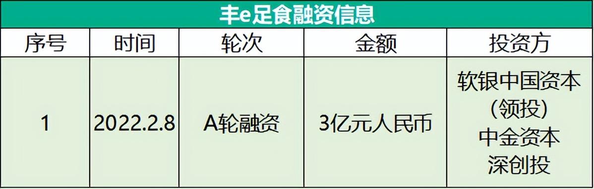 2022年2月,豐e足食完成3億元人民幣的A輪融資,由軟銀亞洲風險投資公司(SoftBank Ventures Asia)領投,中金資本旗下中金文化消費產業股權投資基金、深圳市創新投資集團跟投。
