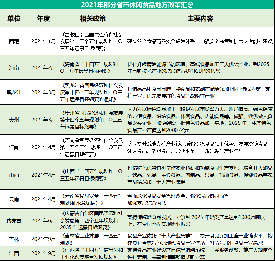 同時,各省市出臺的相關政策也更加重視休閑食品安全和特色食品發展,如《山西“十四五”規劃和二O三五年遠景目標綱要》提出,要打造特色優勢有機旱作農業科研和功能食品生產基地,培育壯大釀品、飲品、乳品、主食糕品、肉等農產品精深加工十大產業集群。