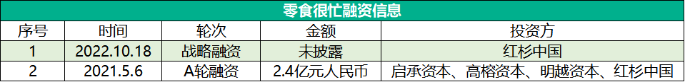 2021年4月,零食很忙完成了2.4億元人民幣的A輪融資,由紅杉中國與高榕資本聯合領投,旨在進一步推動公司的全國化發展和品牌化升級。