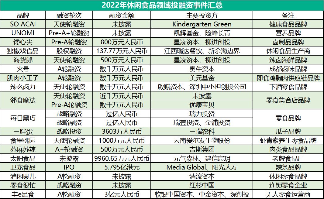 表:2022年休閑食品賽道融資事件匯總 數據來源:FBIF食品飲料創新,35斗繪制