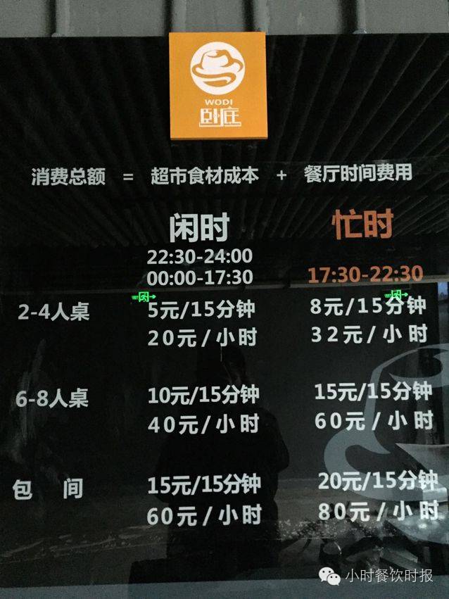 餐廳里提示消費模式的牌子隨處可見,消費總金額=食材的成本價+用餐時間費用。據引位員說:在這里坐八個小時才能跟傳統火鍋店的消費金額一樣價。除非你在這里涮的全部是牛羊肉。