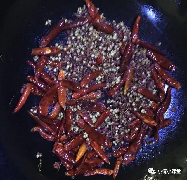 2.放一點點植物油潤鍋,下干辣椒、干花椒略炒一下。