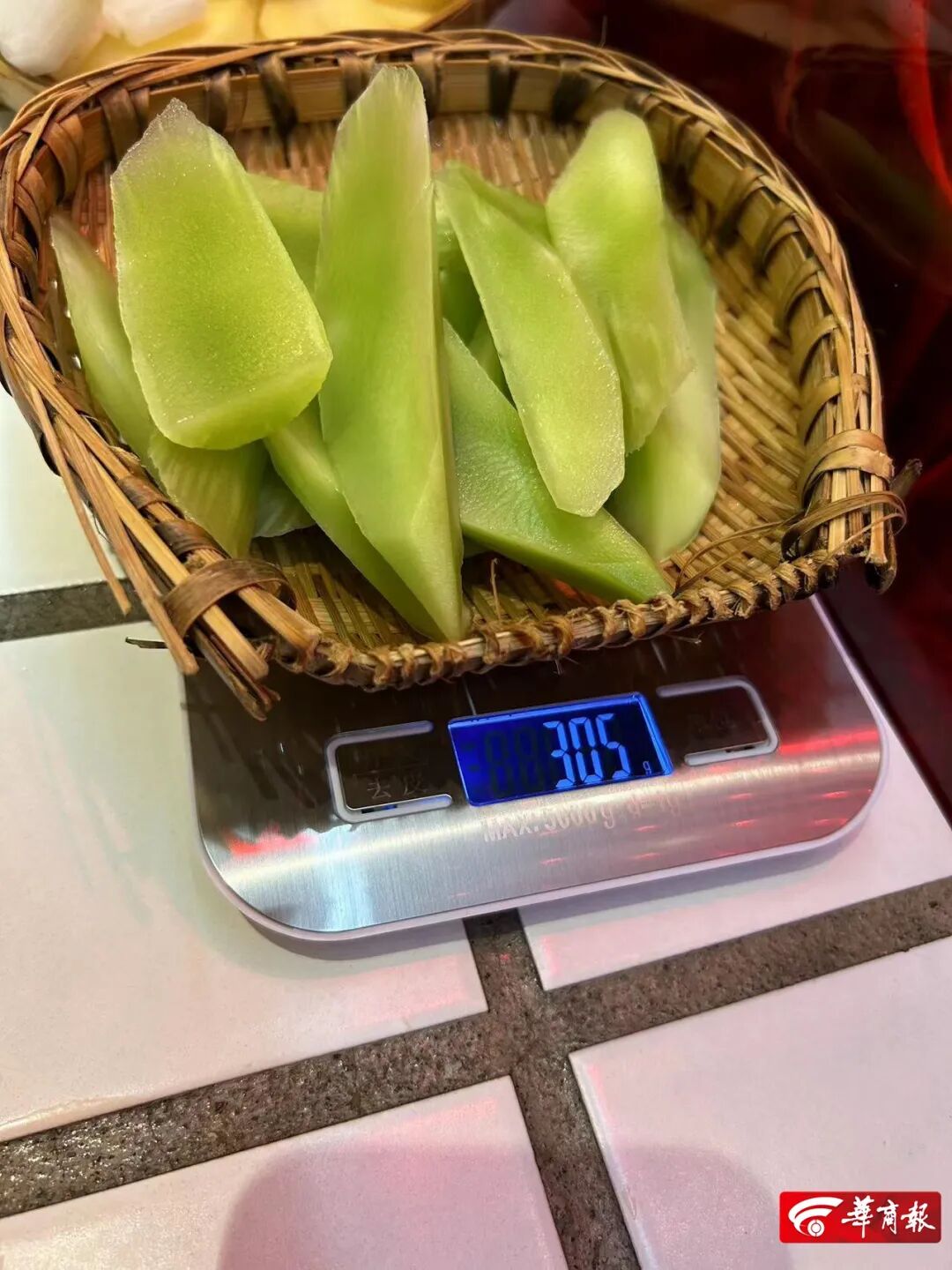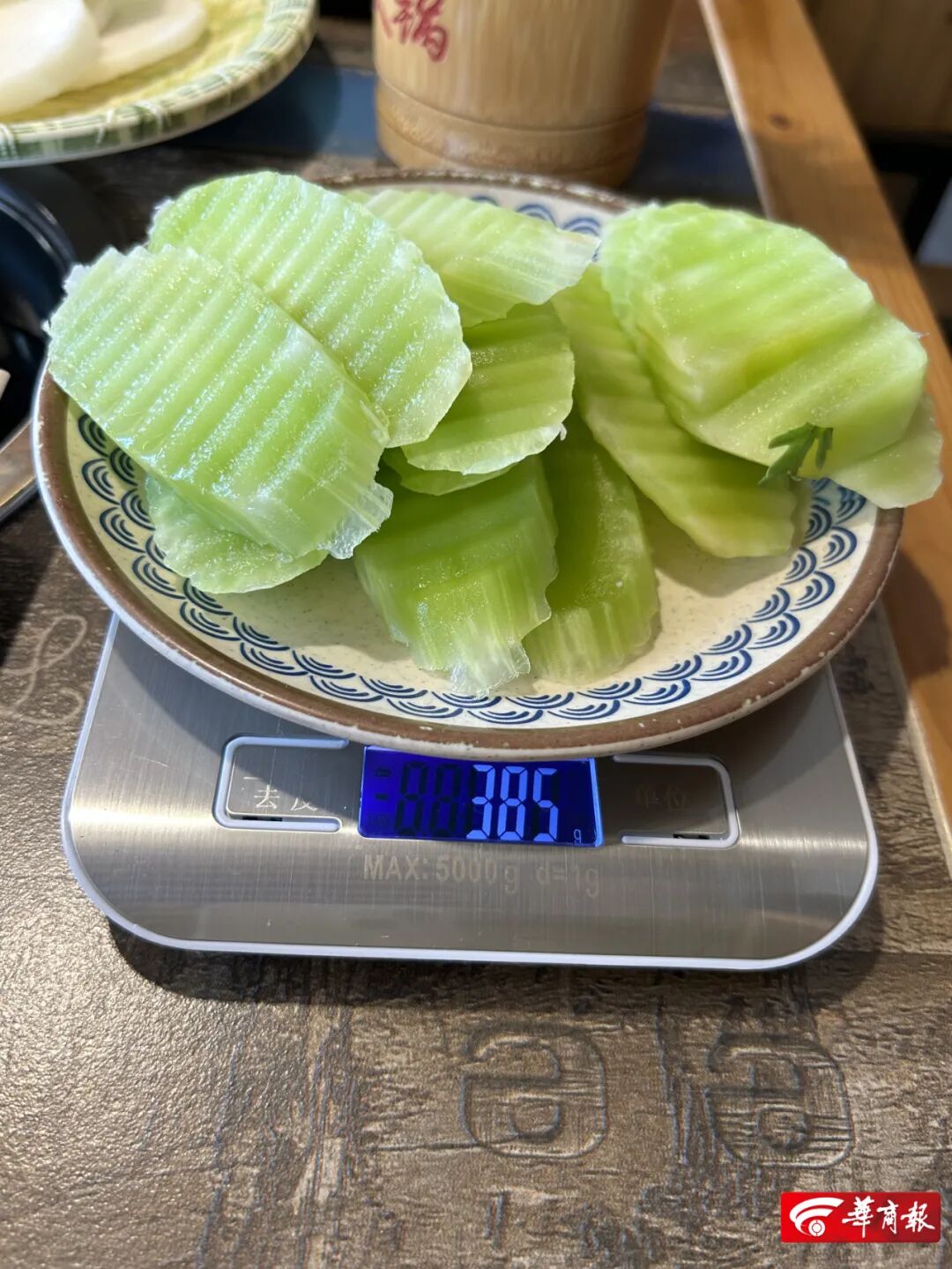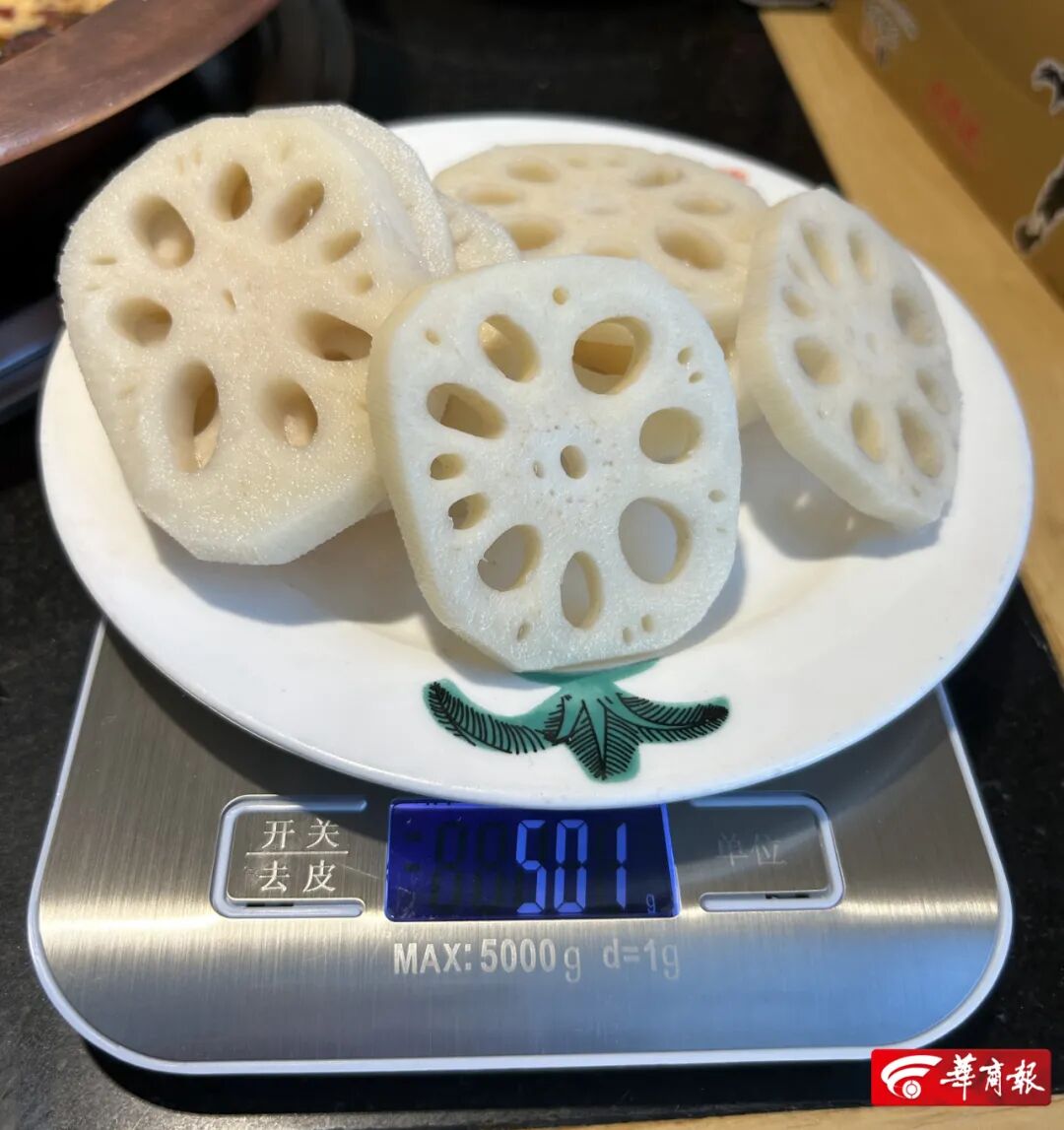 沙沙土豆31.25元、紅薯21.7元、白蘿卜19.9元、青筍33.6元、冬瓜26.9元、娃娃菜31.4元。海底撈后堂經理稱,某些省市會有地域特色菜。在西安,各家門店上菜的種類、分量規格是一樣的,根據市內A、B、C三類商圈,價格會有不同。內部有上菜的分量標準,對外是半份或整份。3月2日晚,記者加了朱光玉火鍋館員工企業微信后,掃碼點餐。點了萵筍頭、土豆片、娃娃菜、冬瓜、藕片5種素菜,都在竹篾編制的小簸箕上盛放。朱光玉火鍋館的菜品只有“份”一種規格,未標注具體克重。借以稱重的小簸箕68g。同一測量方法及算法,5種菜品售賣價格及實際重量一一對應:萵筍頭(237g)9元、土豆片(285g)6元、娃娃菜(255g)10元、冬瓜(264g)6元、藕片(224g)10元。萵筍頭19.0元、土豆10.5元、娃娃菜19.6元、冬瓜11.4元、藕片22.3元。朱光玉火鍋館大堂經理稱,西安共有3家店,菜品的規格一致。地段位置、裝修成本的不同會導致菜價的不同,后廚出餐有克重標準。娟姐老火鍋(長豐園店)位于西安市長安西路上。3月3日上午,記者在店內紙質菜單上勾選菜品,菜單上標有一份的價格,未有克重。點了白蘿卜、冬瓜、土豆片、高山娃娃菜、大刀青筍、藕片6種素菜。稱重的小瓷盤376g。同一測量方法及算法,6種菜品售賣價格及實際重量對應:白蘿卜(194g)2元、冬瓜(147g)3元、土豆片(220g)5元、高山娃娃菜(241g)6元、大刀青筍(148g)6元、藕片(165g)8元。