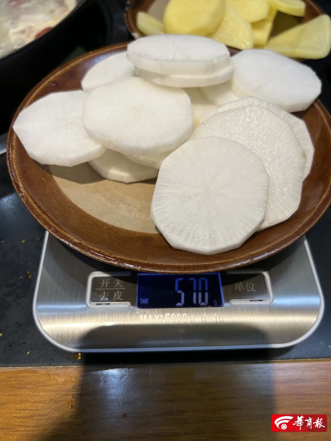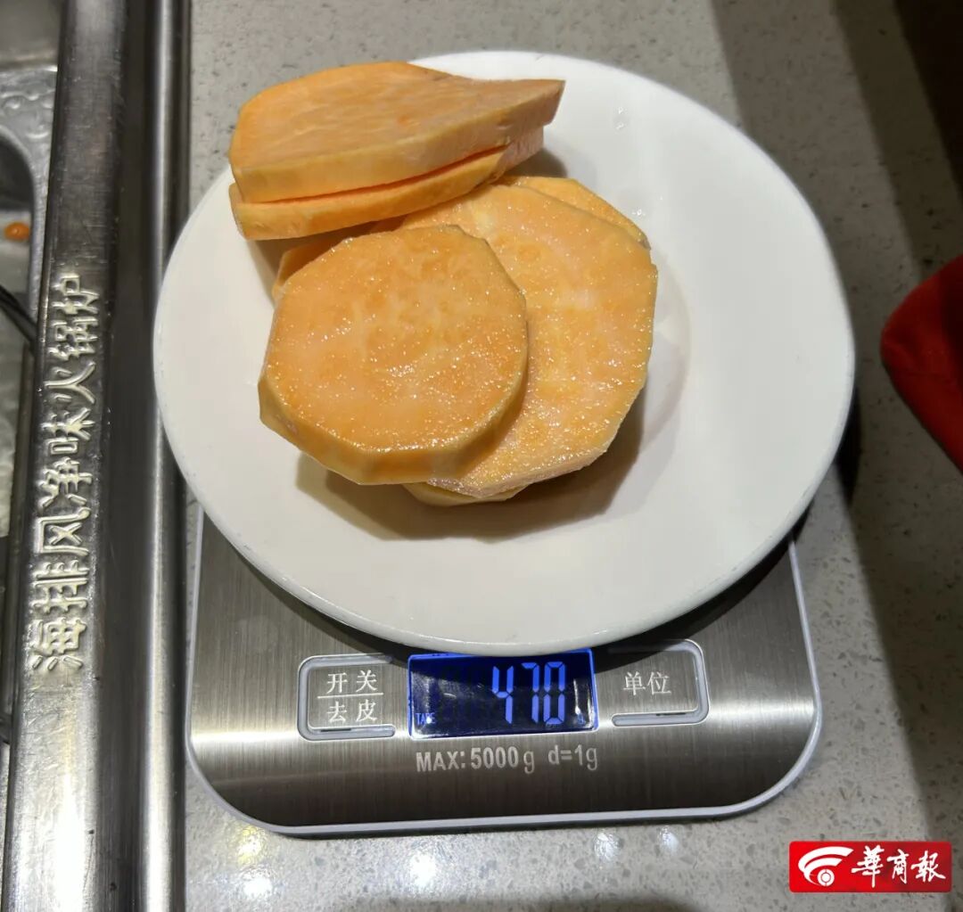 華商報記者準備了廚房電子秤1臺,根據大眾點評APP的智能排序,隨機實測了海底撈(小寨店)、朱光玉火鍋館(鐘樓店)、娟姐老火鍋(長豐園店)、大重慶精品真味火鍋(北長安街店)、老版火鍋(半坡國際店)。在海底撈(小寨店),記者使用微信小程序下單了紅薯、娃娃菜、青筍、冬瓜、白蘿卜、海底撈1號沙沙土豆等素菜,規格均為半份。下單時,未看到整份或半份對應的克數。盛放沙沙土豆、紅薯、白蘿卜、青筍的碗內放有冰塊保鮮。將店內白盤子放在電子秤上,稱重286g。稱重過程中,保持盤內無水漬。按照同一測量方法及算法,6種菜品售賣價格及實際重量為:沙沙土豆(半份160g)10元、紅薯(半份184g)8元、白蘿卜(半份176g)7元、青筍(半份149g)10元、冬瓜(半份167g)9元、娃娃菜(半份175g)11元。