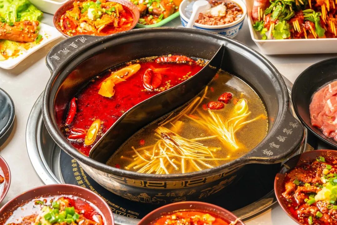 菌菇養生鴛鴦鍋進店必點,一邊是麻辣鮮香的牛油全紅鍋,花椒、辣椒等原材料都是空運而來;一邊則是新鮮現熬的菌菇湯,養生達人必備。