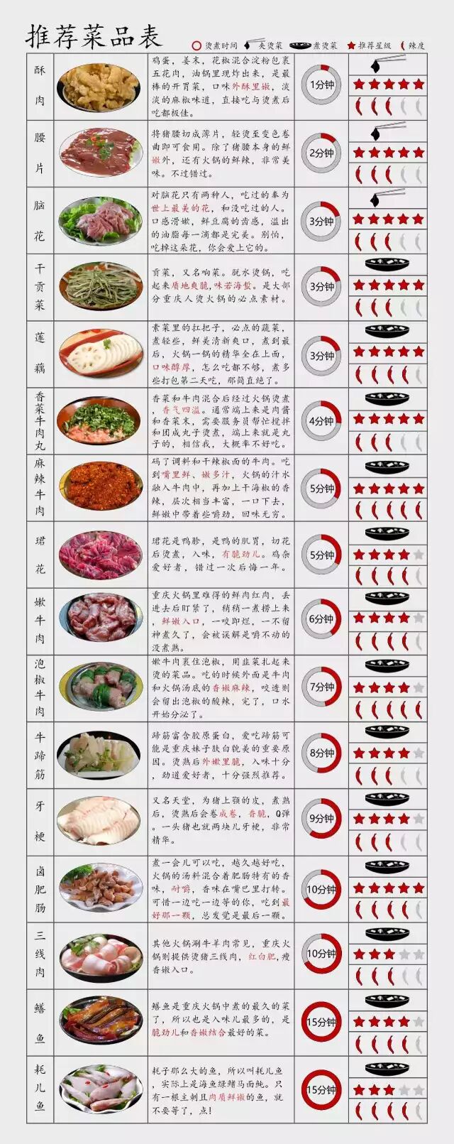 除了這些以外,我們把值得嘗試,你也很可能沒吃過的菜羅列出來,并且把這些菜品分類列表,分別記錄燙菜類型,燙熟需要的時間,燙過后的辣度,并附上我們推薦的星級以及理由,希望可以幫助你裝作是經常來吃的老重慶。