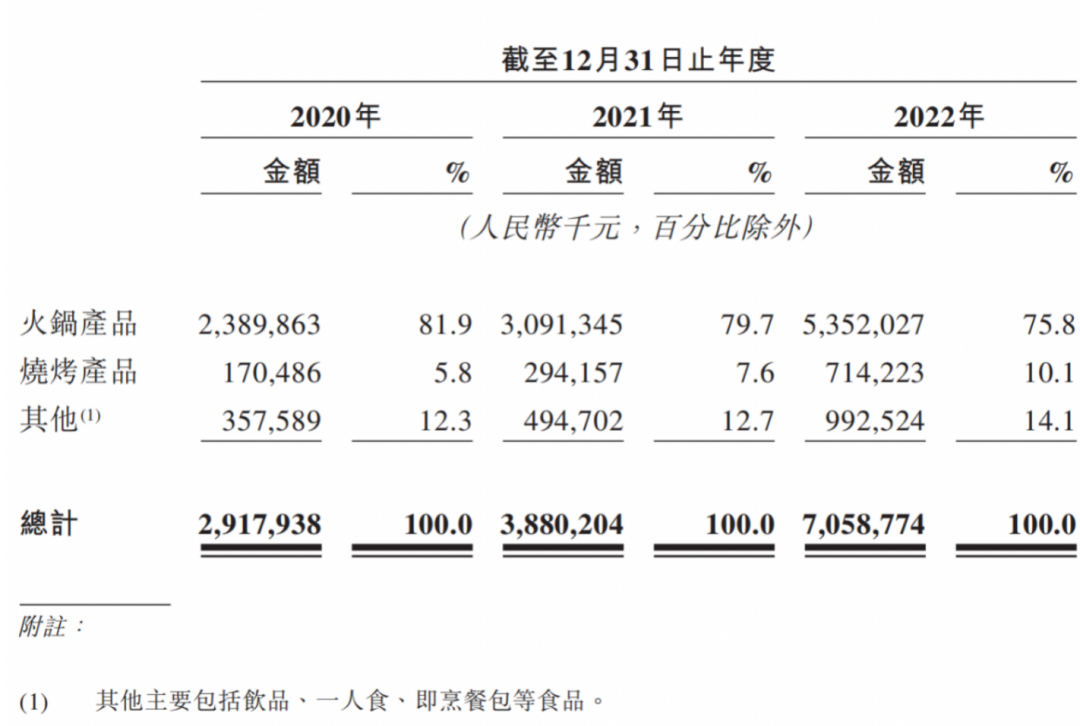 業績方面,2020年-2022年,鍋圈食品的營收分別是29.647億元、39.578億元、71.735億元。其中,火鍋產品的營收占比分別為81.9%、79.7%、75.8%;燒烤產品的占比分別為5.8%、7.6%、10.1%;其他產品(包括飲品、一人食、即烹餐包等)的占比則為12.3%、12.7%、14.1%。可以看出,火鍋食材仍是公司的主要收入來源。