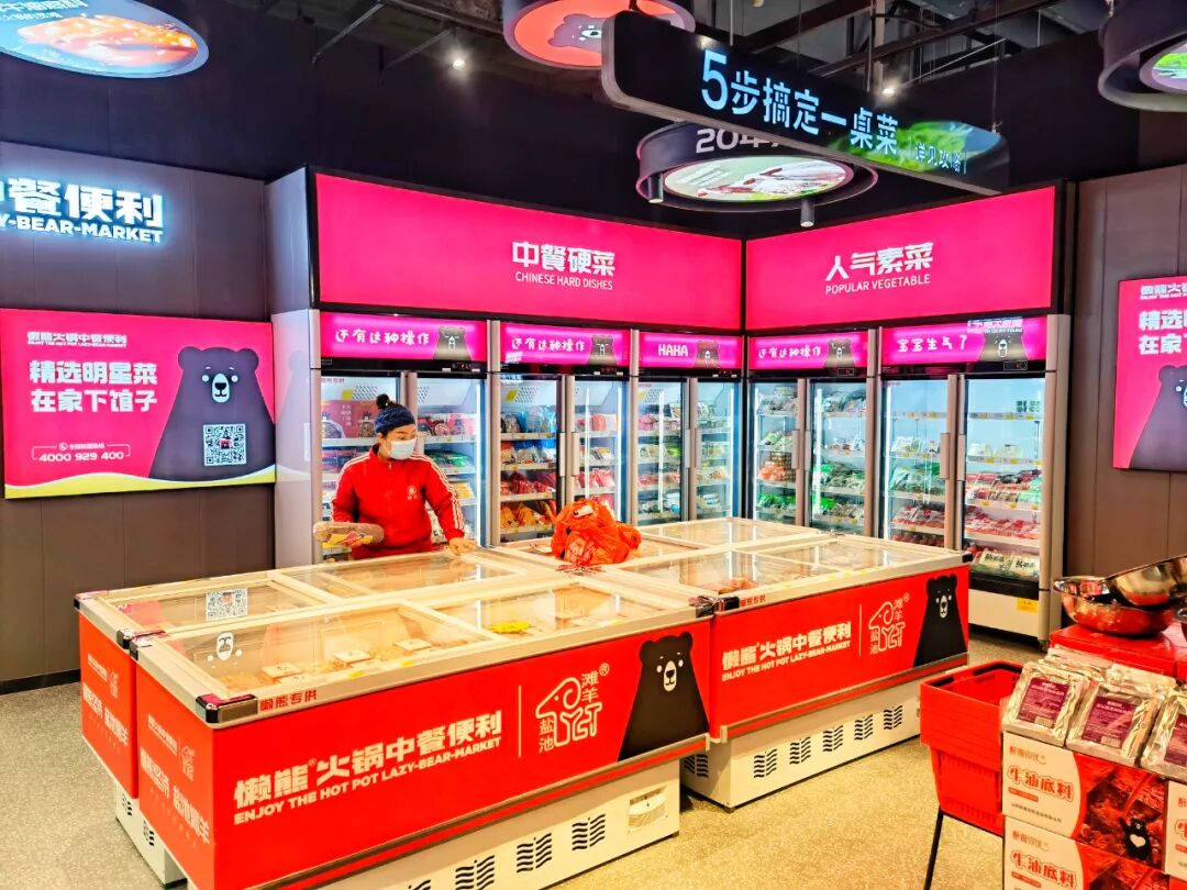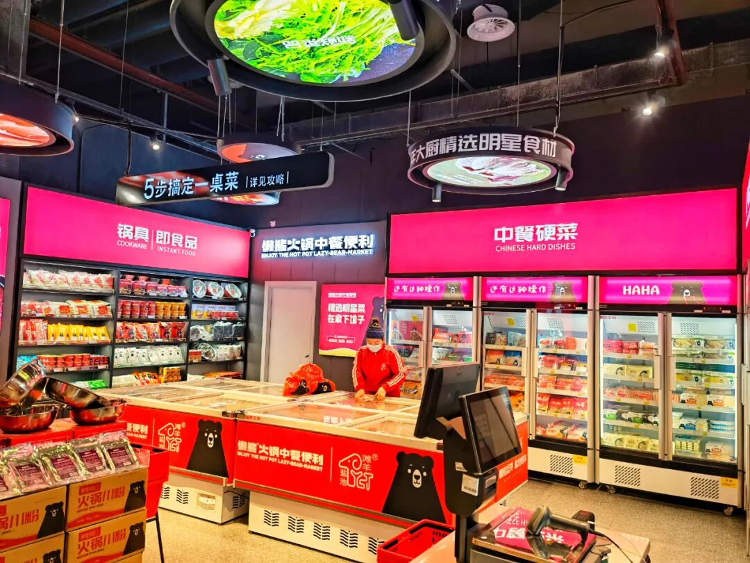 在2018年,高飛請來了專門的人員打造品牌。當時確定了兩個品牌,其中一個品牌名叫懶熊。經營業務就是把他們自己工廠加工的火鍋食材,像牛羊肉、蔬菜、丸子等產品,以及一些中餐半成品菜放到小店里去賣。