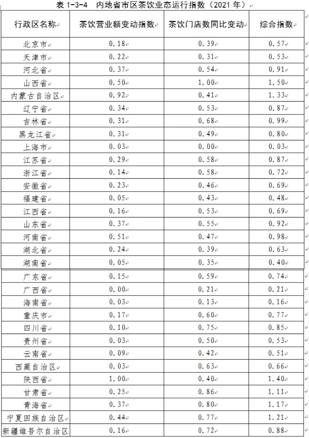 茶飲業亦呈現明顯的增長態勢,多個省份的茶飲業營業額同比增長率接近或突破100%。其中,陜西省茶飲營業額同比增長率最高;山西省茶飲門店數同比增長率最高。綜合來看,山西省茶飲綜合發展指數最高,為1.79。