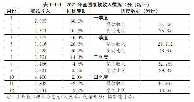 整體來看,2021年,全國餐飲收入合計46895億元,增長18.6%;限額以上單位餐飲收入10434億元,同比增長23.5%。