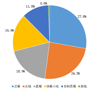 據了解,在調研企業中,各主營業態大致占比情況分布:正餐企業占比27.8%,火鍋企業占比24.3%,團餐企業占比18.9%,快餐小吃類企業占比16.6%,日料、西餐和燒烤企業占比11.8%,其他業態企業占比0.6%。