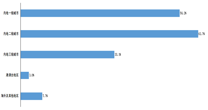 《報告》指出,調研企業中選擇布局內地一線城市的比例56.2%;布局內地二線城市的占比最多,為62.7%,布局內地三線以下城市的比例為33.1%,布局港澳臺地區的比例為3.0%,布局海外或其他地區的比例為7.7%。