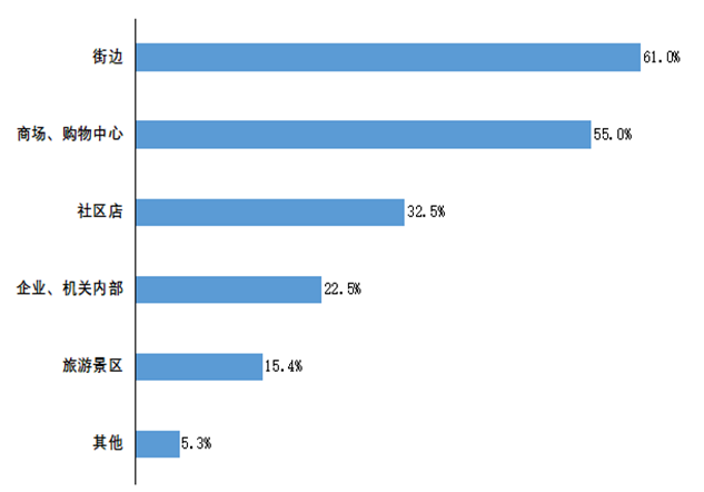 《報告》的調研結果顯示,調研企業以“街邊”為主要布局選擇,布局選擇比例為61%;商場、購物中心布局比例為55%;社區布局比例為32.5%;企業、機關內部布局比例為22.5%;旅游景區布局比例為15.4%;其他地點布局比例為5.3%。