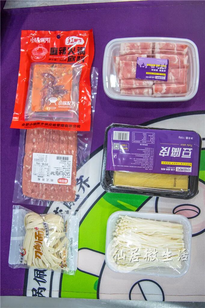 【套餐包括】:200g麻辣底料一份(12元);培根一份(10元);金針菇一份(5元);刀削面一份(3元);牛肉一份(17元);豆腐皮一份(6元)