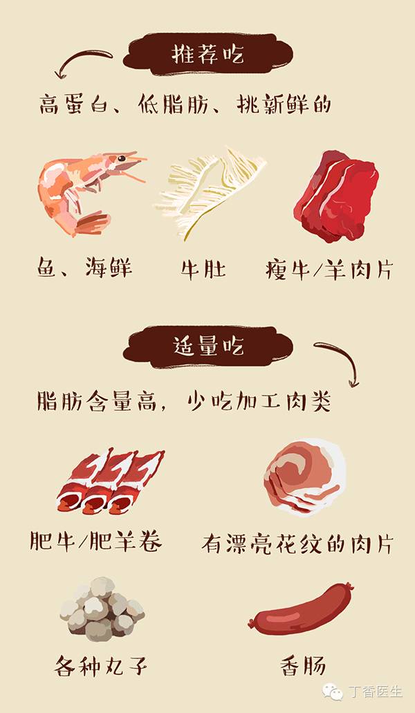 適量吃:肥牛、肥羊卷(脂肪含量有 30%)、有漂亮花紋的肉片、肉丸、魚丸、午餐肉、香腸