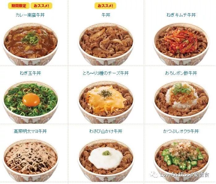 牛丼界的元老級人物,創業于1899年。到2003年為止在日本菜單幾乎只有牛丼,以超低價著稱。2003年后因瘋牛病,日本一時停止美國牛肉進口,使得用美國牛肉為主的吉野家不得不增加新菜單。其標準碗牛丼的定價,幾乎為日本國民所關心,其價格也一定程度反映日本的社會情況。