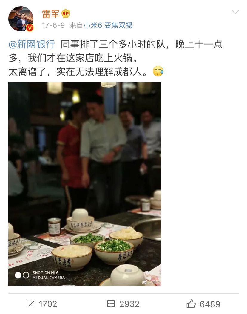 17年的時候,雷軍去成都出差,工作結束后,和同事一起去吃火鍋。