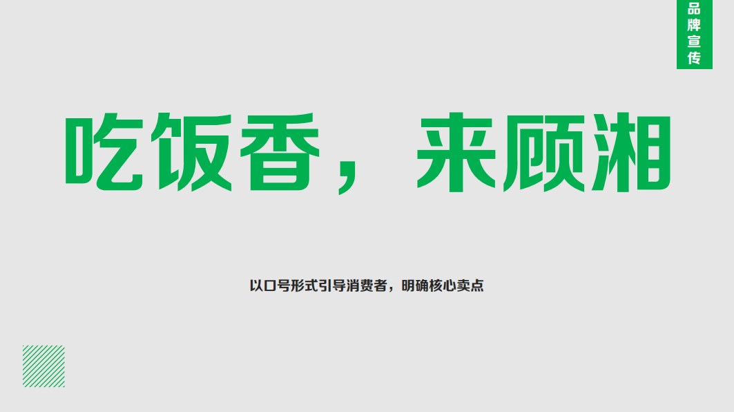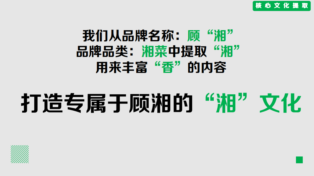 我們從品牌現有的優勢資產出發,首先是品名:“顧湘“意為”故鄉“,飽含了創始人對”家鄉“的熱愛,對湘菜原汁原味”香“的堅持。其次是創始人創立品牌的初心:讓消費者”走進顧湘,品味故香“,進而通過味道帶消費者回到湖南的”故鄉“。