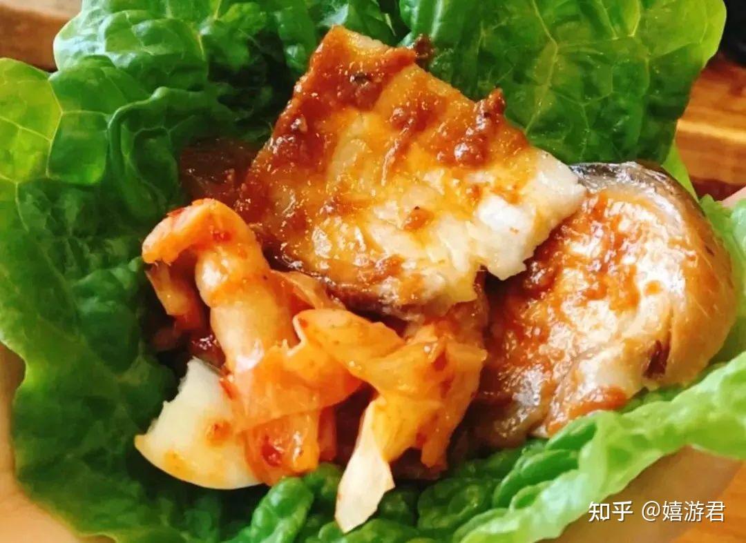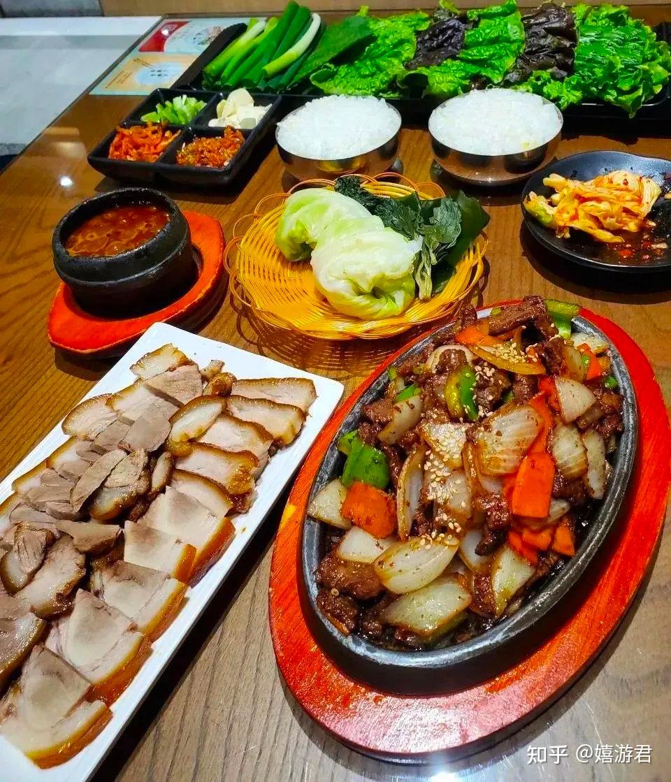 包飯就是把肉給你烤好之后上上來,然后用生菜或者蘇子葉就著醬料、泡菜和米飯包在一起吃。肉的話有肘子肉、五花肉、牛肉等多種選擇,有點像韓國烤肉的吃法。