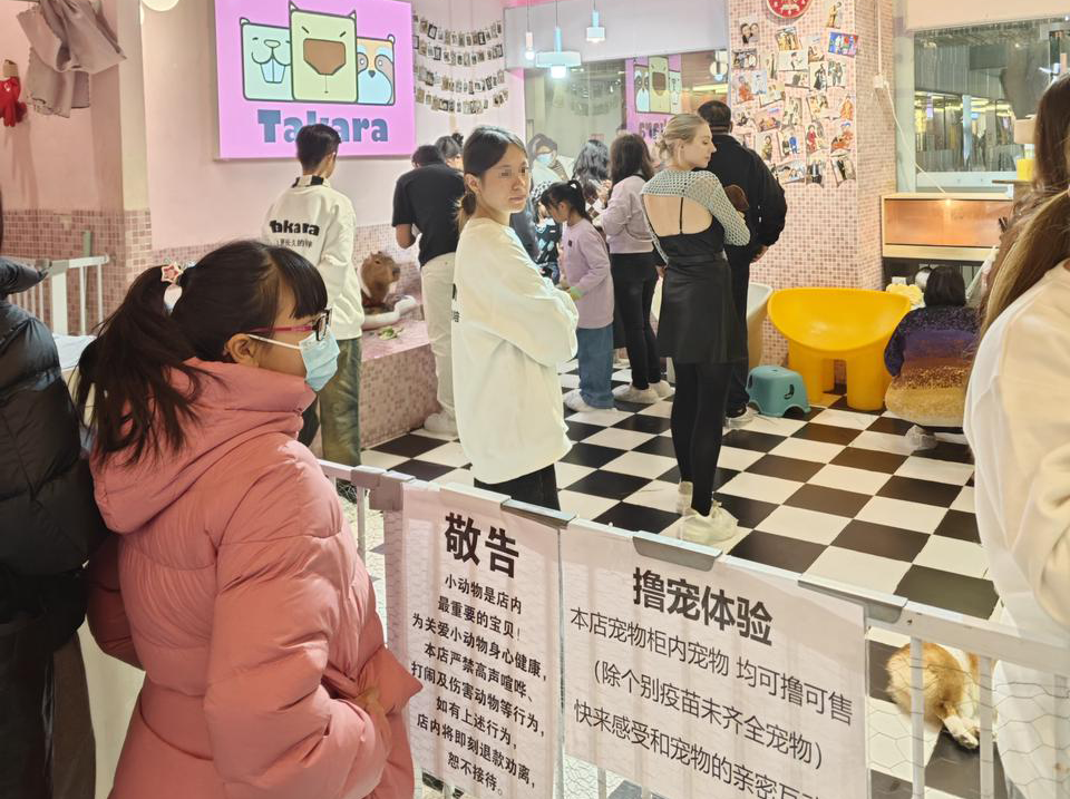 在商場四樓,一家貓咖前面擺了幾把椅子,其中一位大爺就是老板,負責收錢。30多平米的店里已經擠滿了21個顧客,外加四十多只貓。還不斷有年輕女孩過來問,擼一次貓多少錢。一位做果切的老板告訴億邦動力,年輕人不要做餐飲,不如去做美甲之類的面向年輕人的生意。