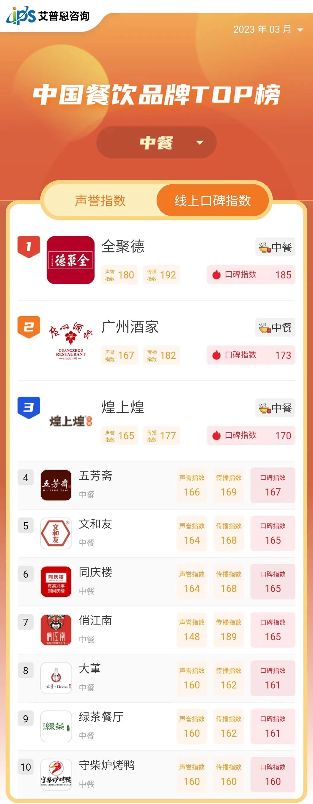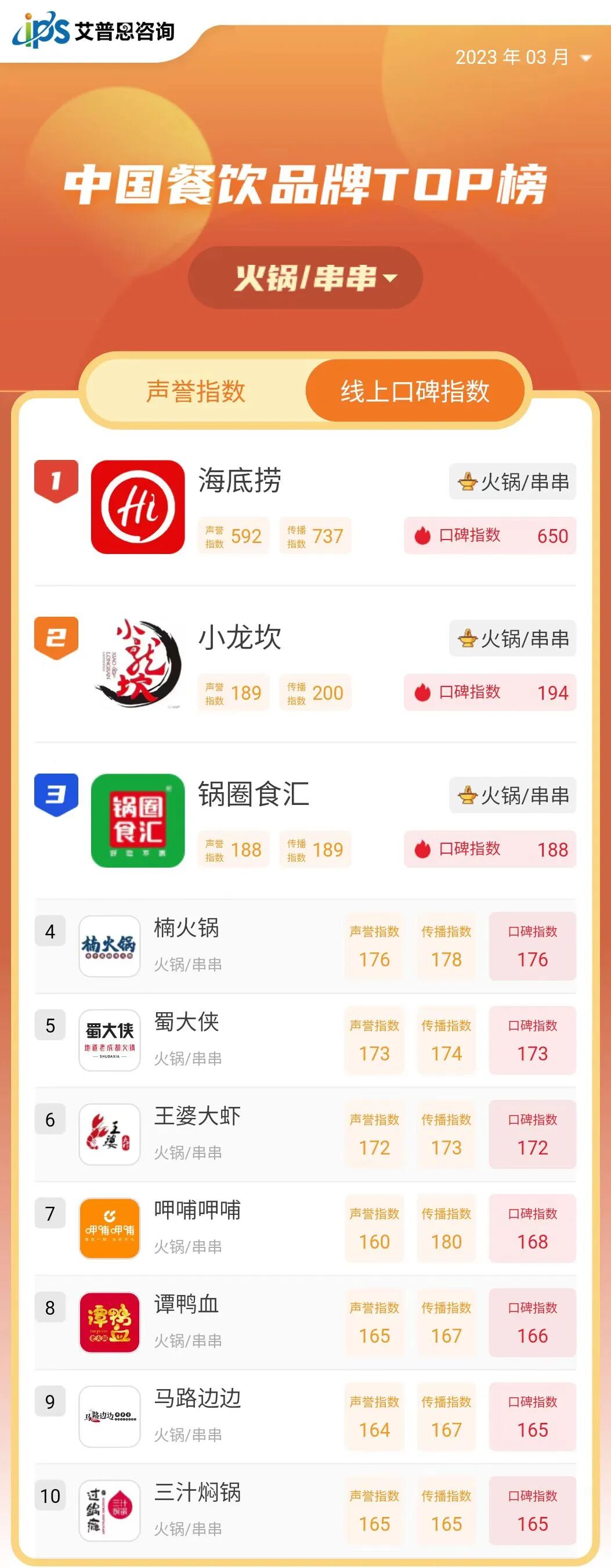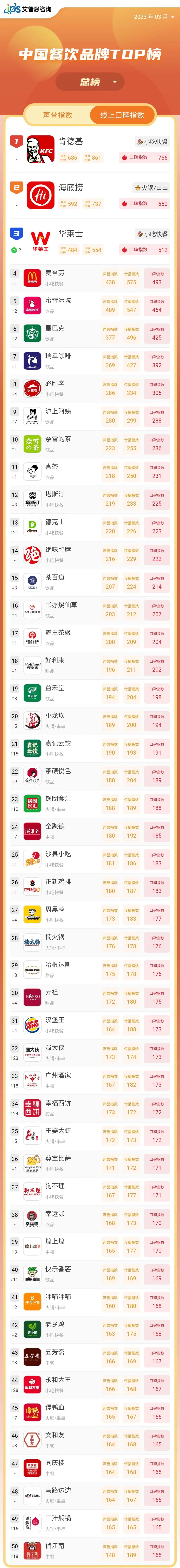 艾普思指數|2023年03月中國餐飲品牌線上口碑指數TOP50