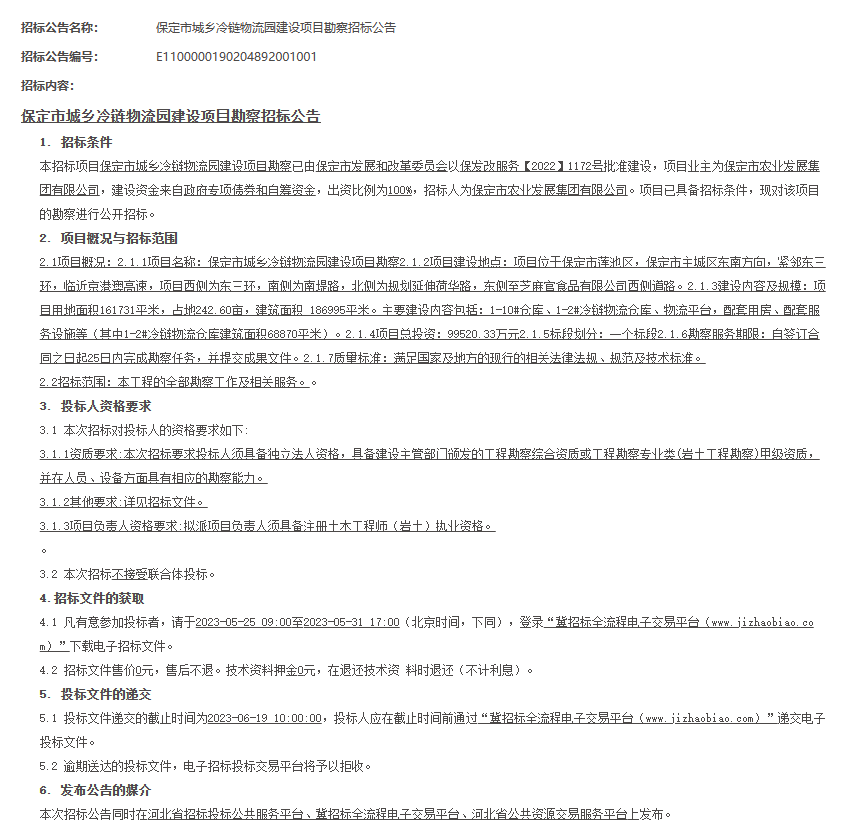 242.6畝!保定城鄉冷鏈物流園建設項目勘察招標公告