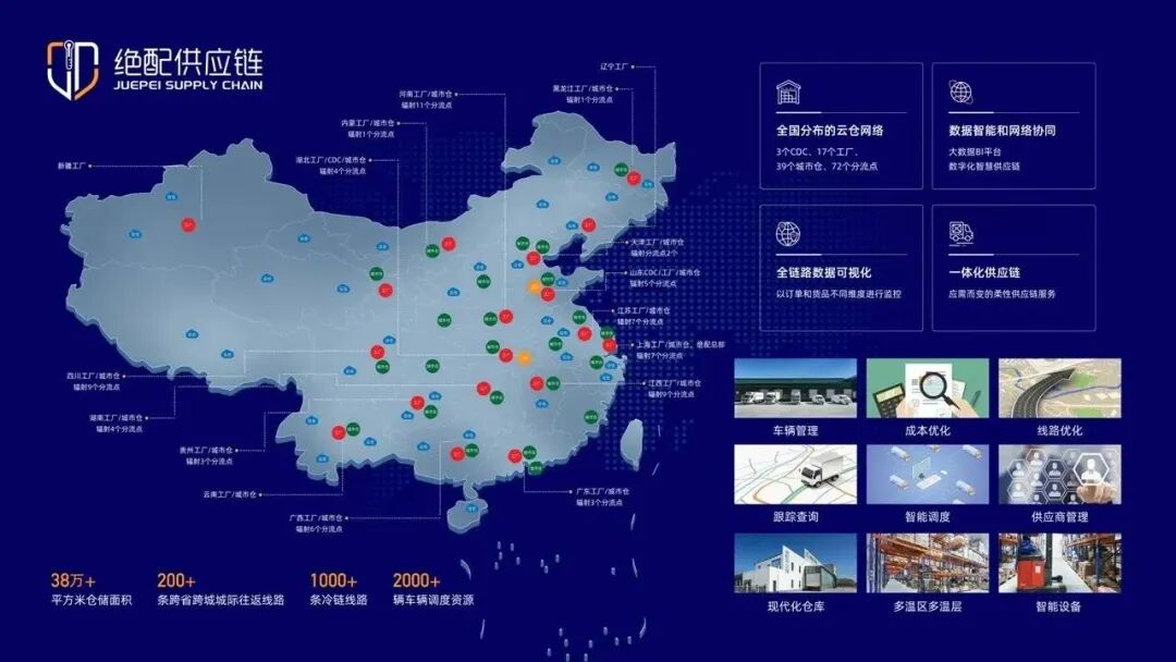 絕配供應鏈以自身業務體量為基礎,使用分布式網絡布局集“倉儲、運輸“于一體的主網絡中心,覆蓋中國絕大部分食品生產和消費地,可以有效的彌補餐飲連鎖企業布局全國的物流短板,幫助企業實現高彈性、低成本、輕便型增長的新模式。截至目前,絕配供應鏈城際干線網絡覆蓋全國四橫四縱冷鏈主干網,擁有200條跨省跨城城際往返線路,1000+條冷鏈線路;區域城配網絡通過城市分流點、分撥倉覆蓋周圍200-300公里的城市配送區域且具備日配日達能力;在全國范圍內擁有3個CDC,21個工廠,39個DC,72個FDC。遵循CDC+工廠倉+城市倉+合作云倉的多層次云倉布局覆蓋全國;服務門店超過10萬+家。