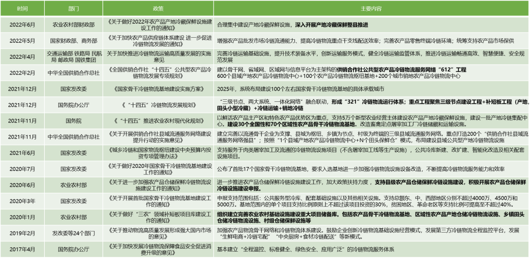 近幾年,國家密切出臺了多項冷鏈物流支持政策。從項目申報資金支持到全國統一布局,目標將于2025年,我國肉類、果蔬、水產品產地低溫處理率分別達到85%、30%、85%。到2035年,我國將全面建成現代冷鏈物流體系,設施網絡、技術裝備、服務質量達到世界先進水平,行業監管和治理能力基本實現現代化,有力支撐現代化經濟體系建設,有效滿足人民日益增長的美好生活需要。