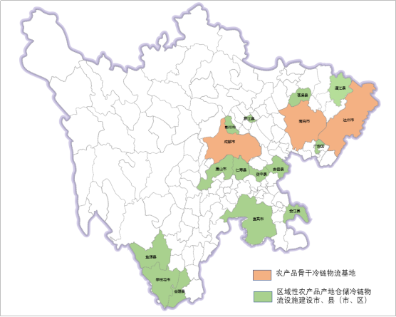 在農產品冷鏈物流領域則包含了農產品骨干冷鏈物流基地+區域性農產品產地倉儲冷鏈物流設施,其布局主要圍繞全國農產品重要產地布局。下圖以四川省布局為例,展示了其主要分布情況。
