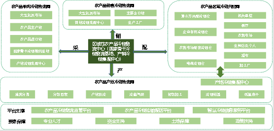 從冷鏈物流的運行體系來看,冷鏈物流主要包含了產、采、銷、配四個體系。以農產品冷鏈物流為例,分別為農產品產地冷鏈物流網、農產品采購冷鏈物流網、農產品銷售冷鏈物流網與農產品區域冷鏈共配網四個要素,相互之間依托區域性農產品冷鏈物流中心、國家骨干冷鏈物流基地等樞紐進行交互。