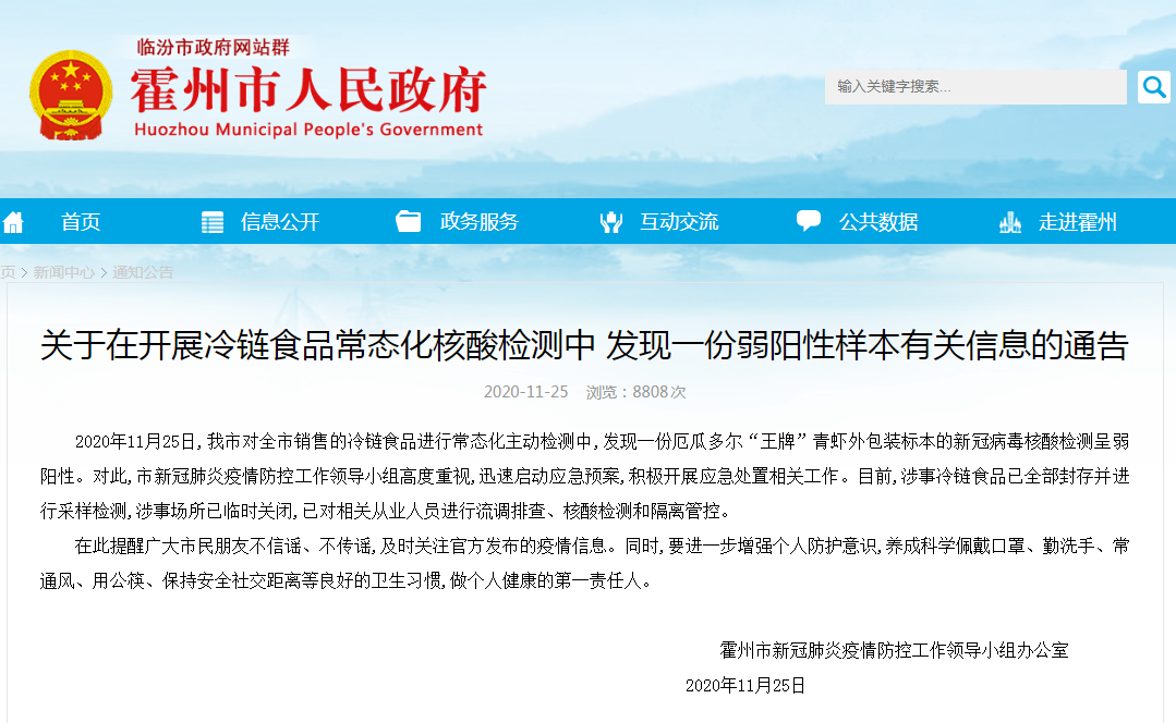 2020年11月25日,我市對全市銷售的冷鏈食品進行常態化主動檢測中,發現一份厄瓜多爾“王牌”青蝦外包裝標本的新冠病毒核酸檢測呈弱陽性。對此,市新冠肺炎疫情防控工作領導小組高度重視,迅速啟動應急預案,積極開展應急處置相關工作。目前,涉事冷鏈食品已全部封存并進行采樣檢測,涉事場所已臨時關閉,已對相關從業人員進行流調排查、核酸檢測和隔離管控。