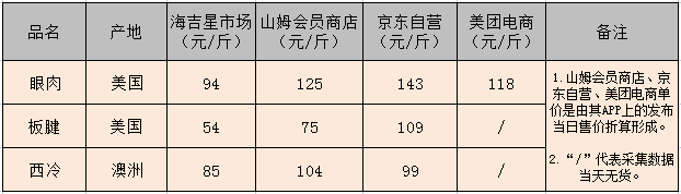 部分牛肉產品海吉星與山姆、京東、美團價格對比